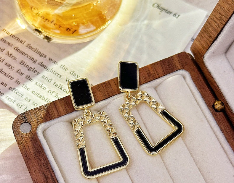 Featuring a bold hollow square design, this piece is crafted from copper with high-quality electroplating in deep black and luxe gold tones, evoking a sense of night-time glamour and strength.